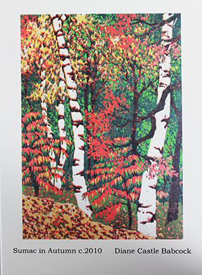 Because prints are created in editions, I can sell my work to many people and still keep one print for myself. One of my goals is to create artwork that is affordable and accessible. Along with framed, matted, and unmatted original prints, I offer notecards and mouse pads. I collect Birch Bark and Birch branches during my travels, which I have incorporated into my work.
