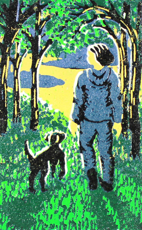 Although some of my imagery is very location specific, other linocuts are more generic in subject matter. My moonlight prints are inspired by my frequent dog walks at all times of the day and night. I also have linoleum block prints depicting dogs with their humans. Since I am a native New Yorker, my linoleum block prints reflect the landscape of upstate New York.